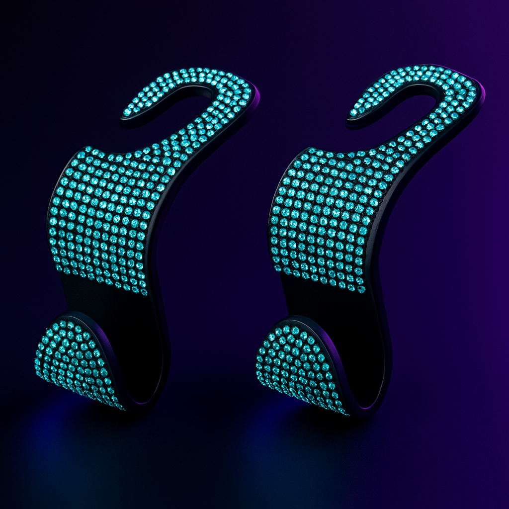 Ces crochets de siège scintillants, incrustés de cristaux, transforment l’appuie-tête de ta voiture en un véritable support multifonction esthétique et robuste.